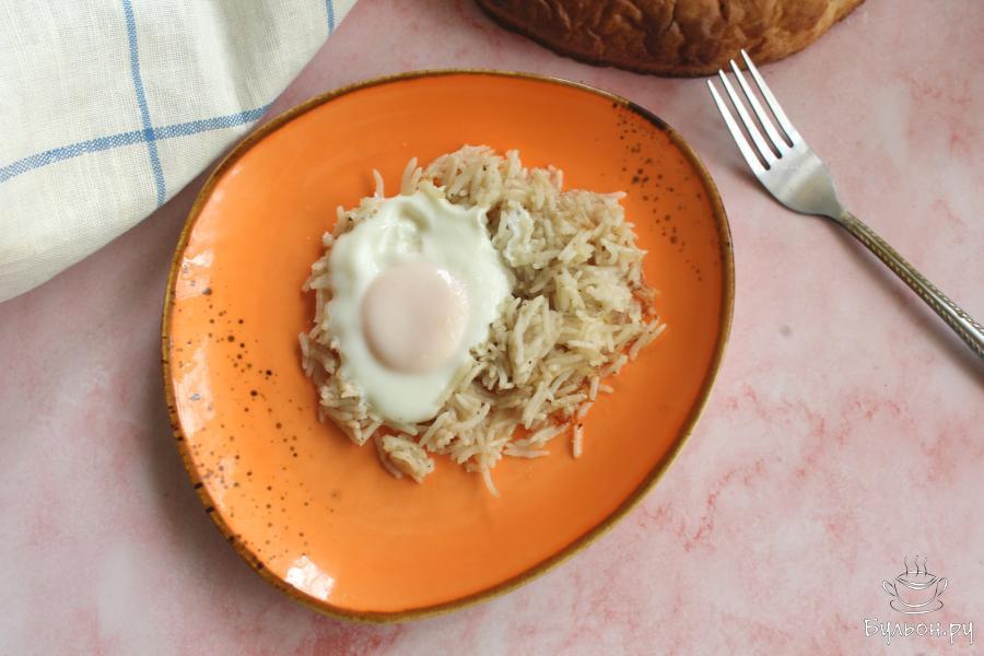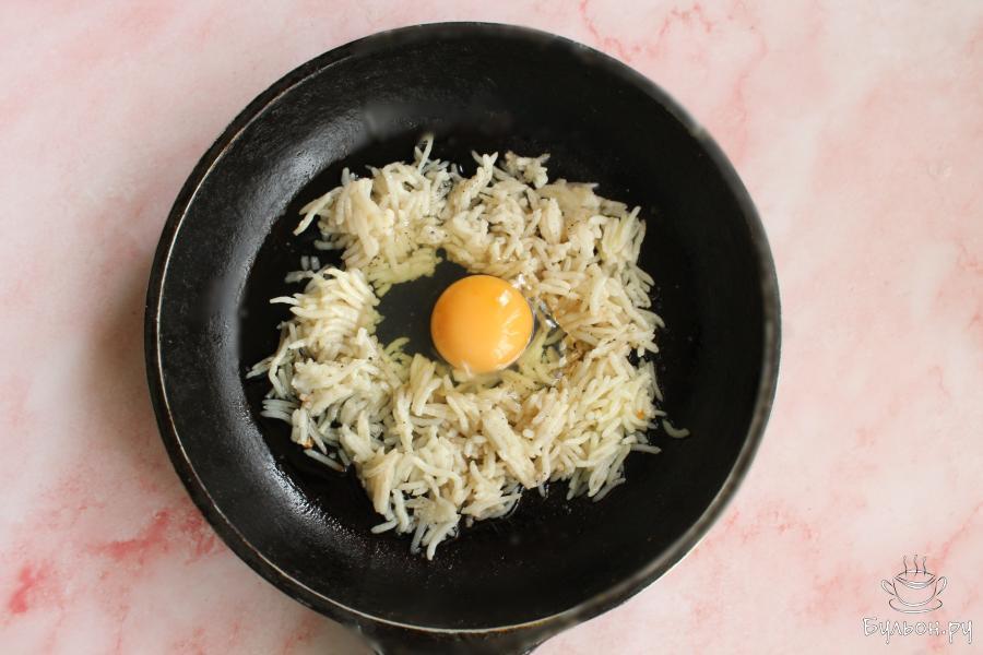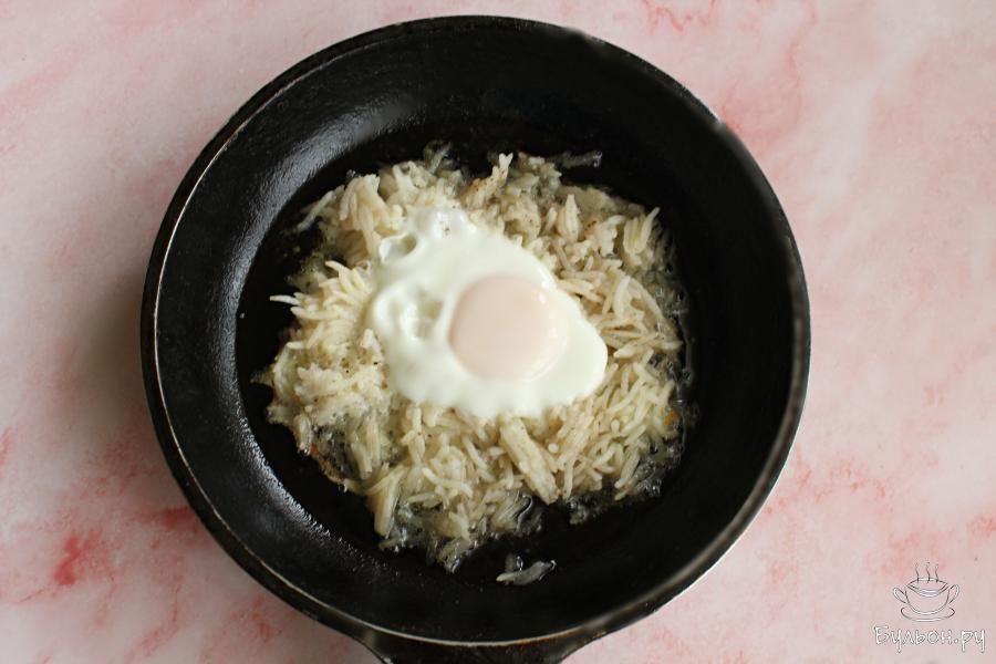 2. Поставить сковороду на огонь, прогреть рис и сделать в середине рисовой горки углубление под яйцо.