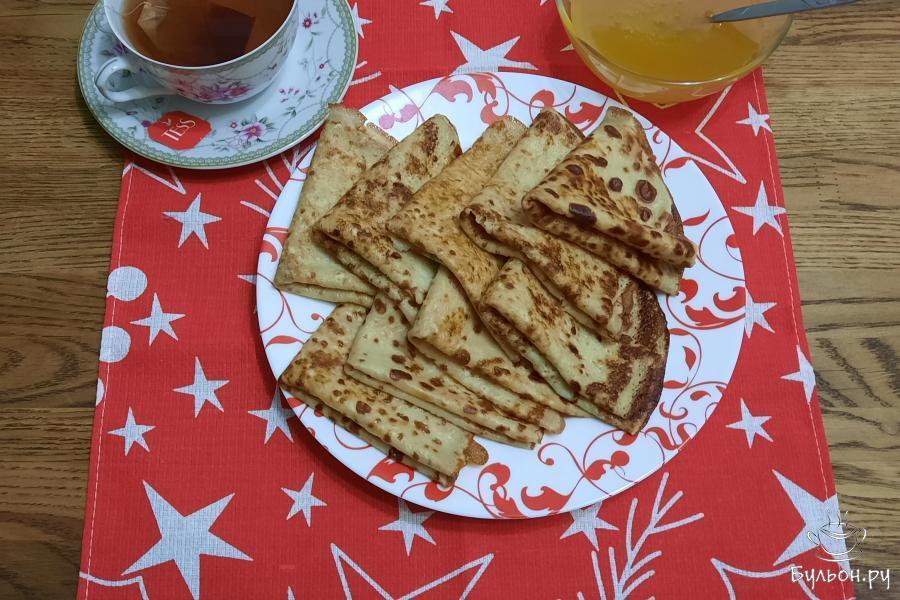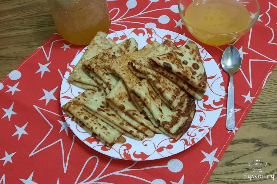 В предверии Масленицы хочу поделиться с вами еще одним рецептом блинов - блины медовые. Но печь их можно не только к празднику, а также к семейному завтраку или к полднику. Так как я живу в Башкирии, а наш край славится медом, блины часто подают с медом. Но в этом рецепте мед добавляется в тесто, вместо сахара. Блины получаются тонкие, мягкие, нежные, вкусные, чувствуется аромат меда. А если еще и подать с медом - получается медовое наслаждение. И это удовольствие для любителей меда. Из этого количества ингредиентов получается 11-12 вкусных блинов.