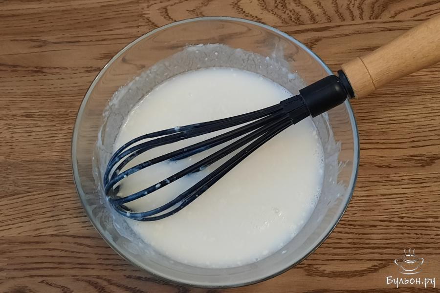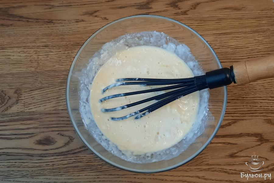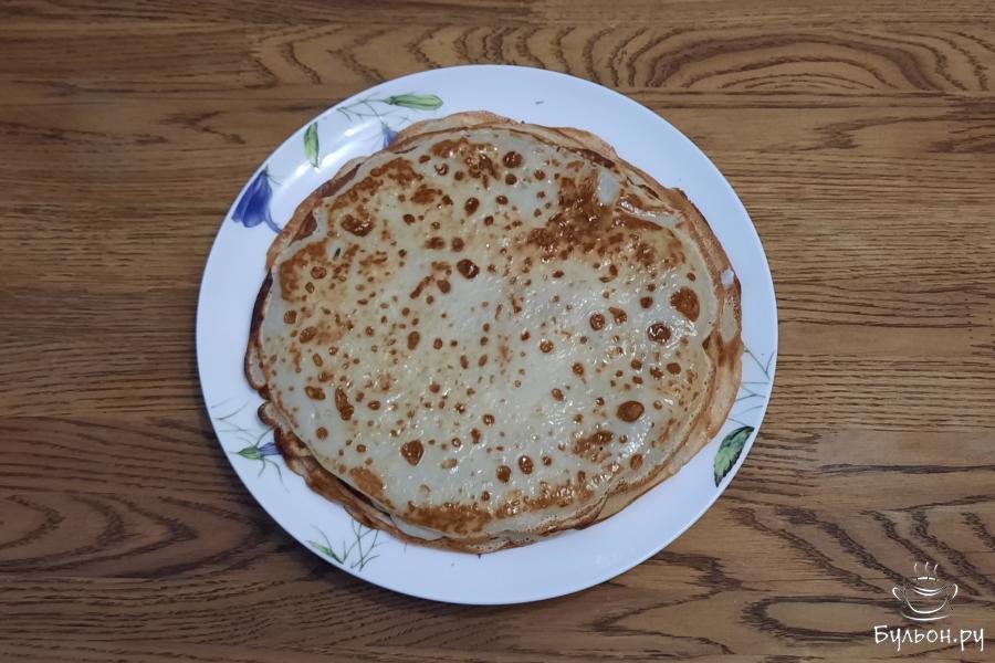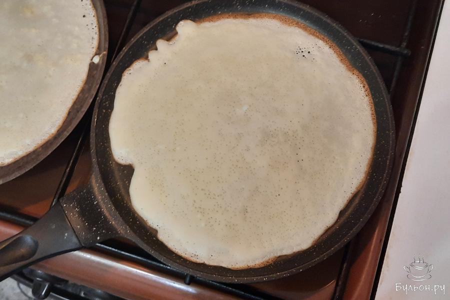 5. Сковороду разогреть, смазать растительным маслом. Влить порцию теста, распределить по сковороде и выпекать до золотистого низа.