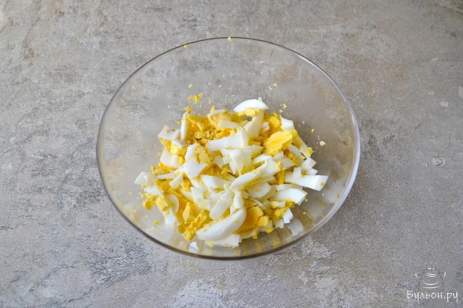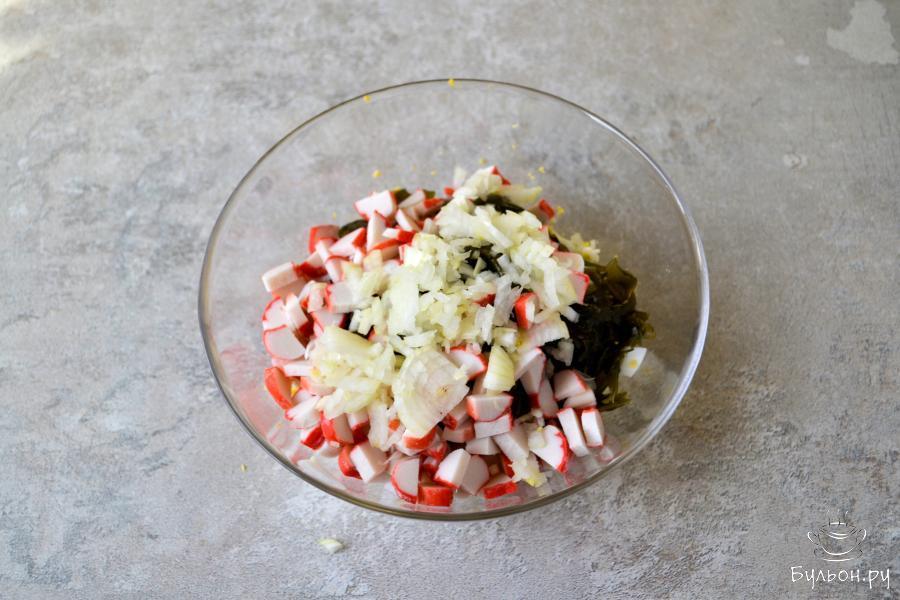 5. Добавьте мелко нарезанный репчатый лук. Добавьте майонез и перемешайте. Попробуйте на соль, если необходимо, то посолите.