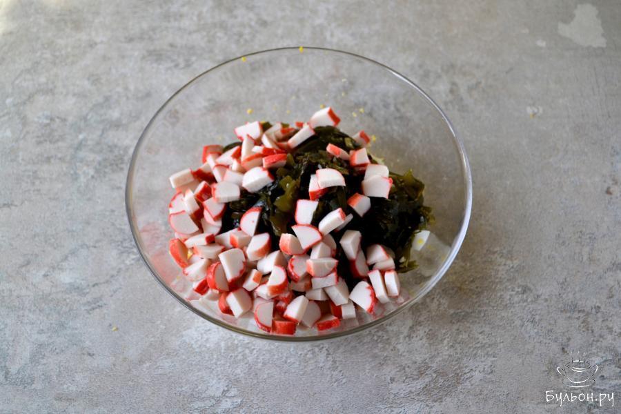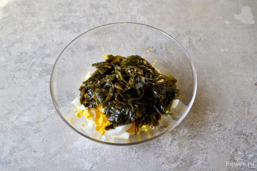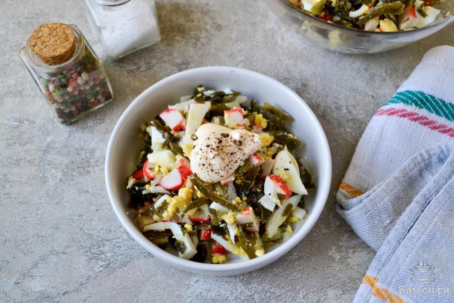 Сегодня у нас вкусный салатик из морской капусты, крабовых палочек и яиц. Капусту можно взять уже готовую, маринованную. С такой капусты, перед добавлением ее в салат, слейте маринад. Если капуста в сушеном виде, то приготовьте ее согласно рекомендациям на упаковке. Залейте холодной водой, чтобы разбухла, затем отварите и охладите. Время этих операций будет указано на упаковке сушеной морской капусты. Салат на скорую руку. Рецепты таких быстрых салатов нужны и выручают они, когда нужно быстро что-то приготовить на стол. Вкусный, сытный и простой в приготовлении салат.