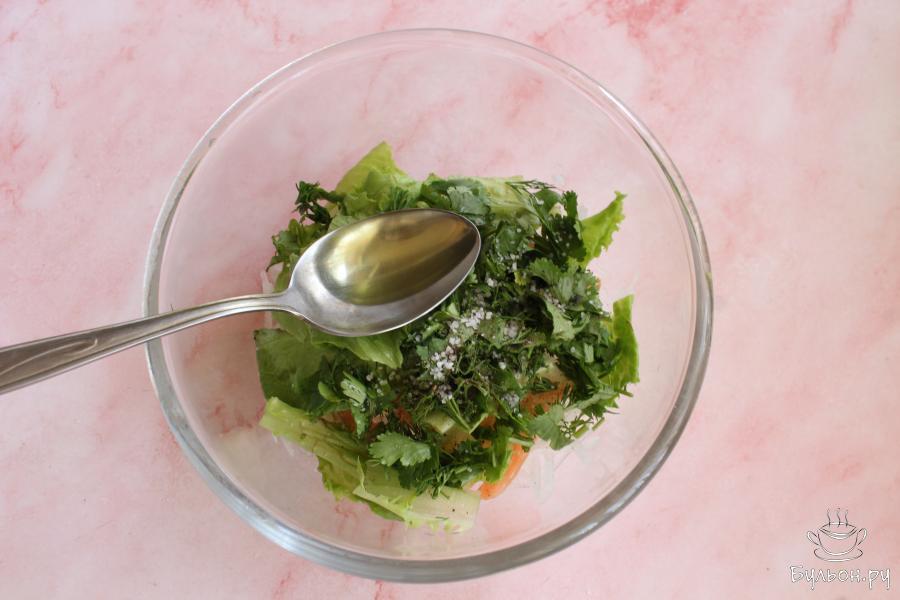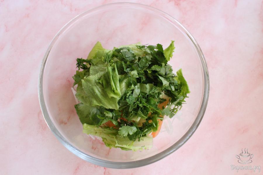 3. Промытые и обсушенные листья салата порвать руками на крупные кусочки. Укроп и кинзу нарезать мелко.