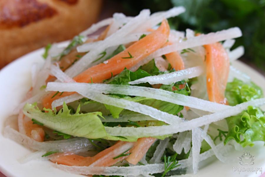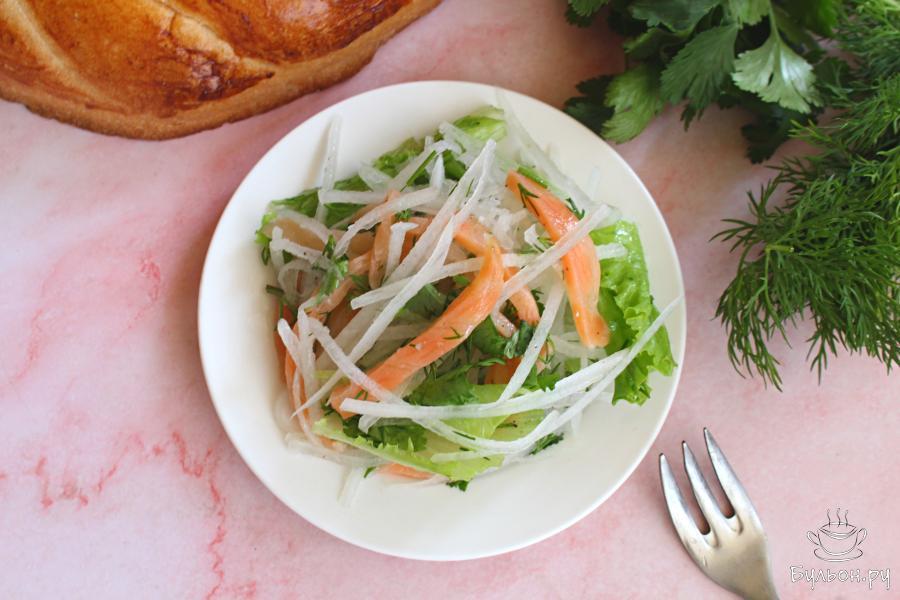 Салат из дайкона с красной рыбой и зеленью будет готов у вас за считанные минуты. Салат получается легкий, полезный, вкусный и очень сочный. Рыбу для приготовления можно взять любую красную, соленую или малосоленую. Если рыба сильно соленая, то салат может не нужно будет солить, тут только пробовать салат и регулировать по вкусу. Зелень для этого салата каждый выберет сам, но латук должен быть обязательно. Такой салат не хранят, его подают сразу, пока латук не потерял объем. Этот салат отлично подойдет для разгрузочных дней.