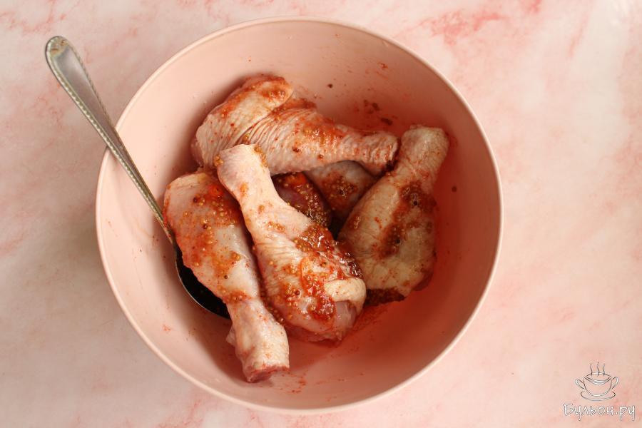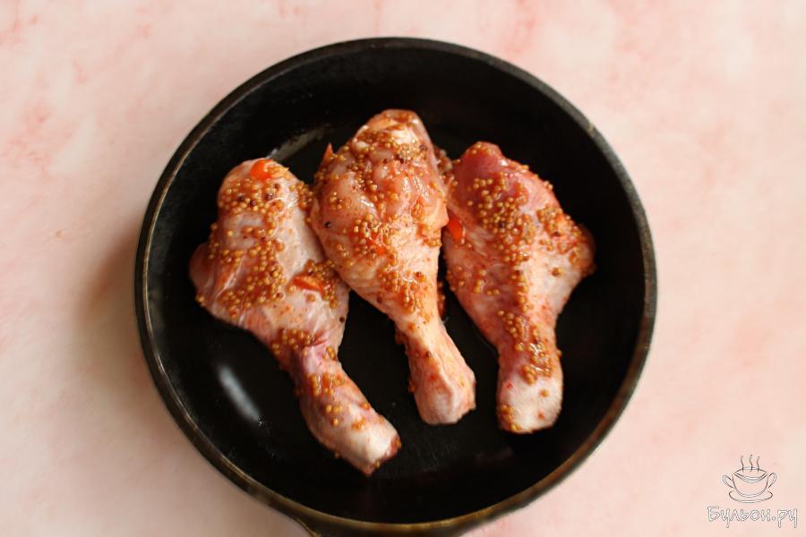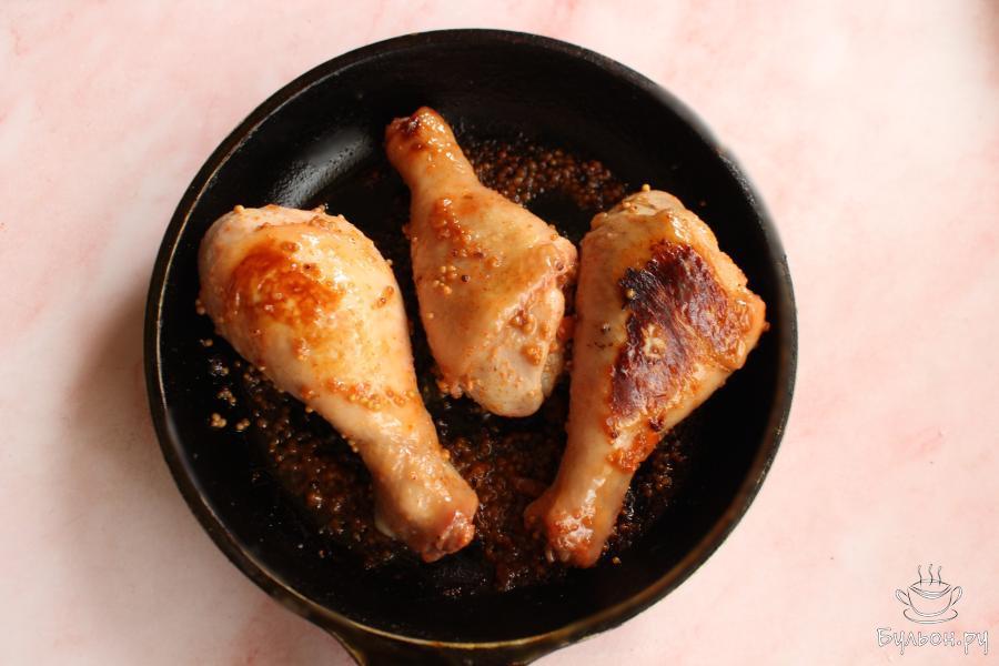 5. Выложить голени на сковороду с маринадом и готовить их на среднем огне. Следить, чтобы маринад не пригорал.