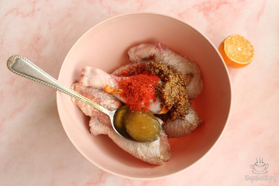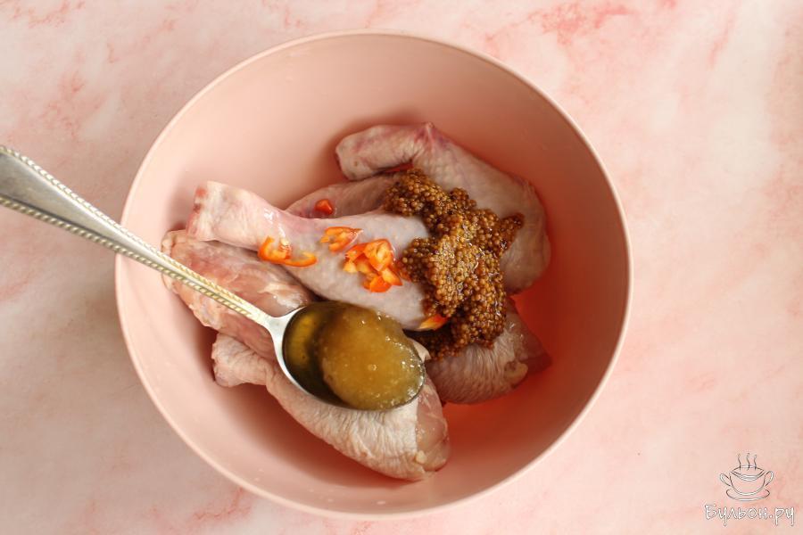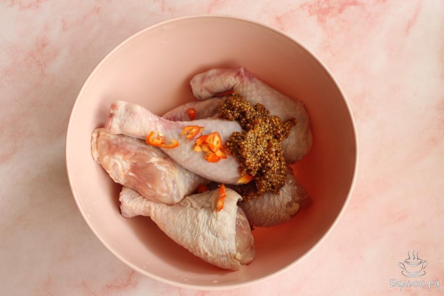 1. Голени промыть, выложить в удобную посуду. Острый перец почистить от семян. Перец без семян мелко нарезать и выложить к голеням, добавить горчицу.