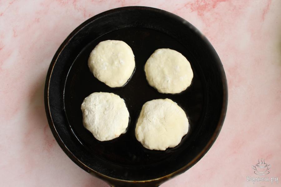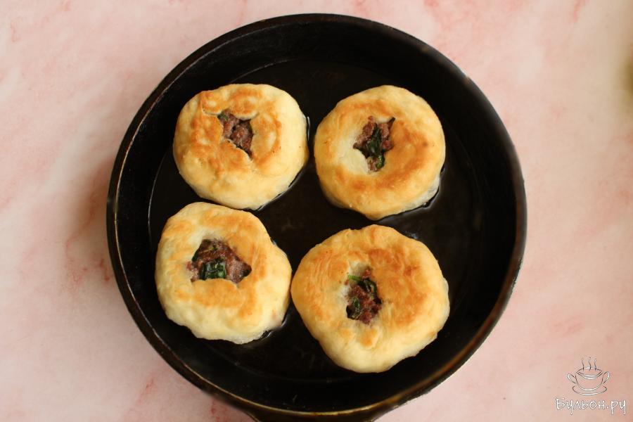 8. На сковороде разогреть масло, выложить беляши отверстием вниз и готовить их до румяного низа. Готовить беляши обязательно на небольшом огне. Масла должно быть много.