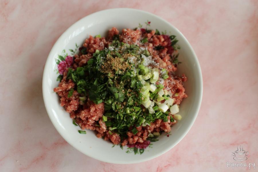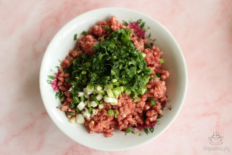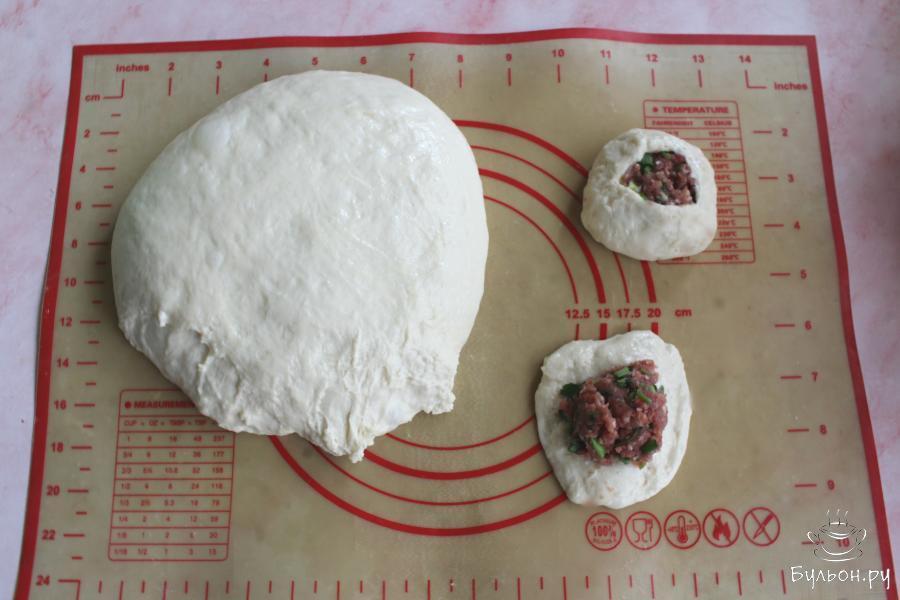 7. Рабочую поверхность смазать маслом или присыпать мукой. От теста ощипывать кусочки размером с крупное яйцо. Делать руками круглые лепешки толщиной около 0.5 см. Выкладывать на лепешки фарш и собирать тесто вверху, формируя мешочек с отверстием.
