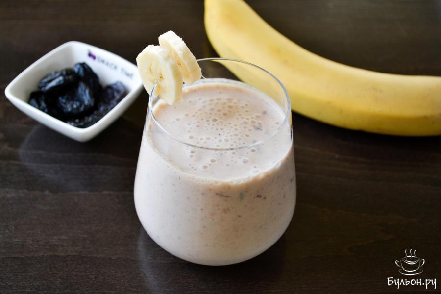 Я часто готовлю себе смузи: из кефира, молока, ряженки с добавлением свежих мягких фруктов, свежих или замороженных ягод, сухофруктов, овощей, пряных трав, специй. Люблю такие вкусные, полезные и очень быстрые в приготовлении перекусы. Смузи можно дополнить дроблеными орешками, семечками, присыпать корицей, какао-порошком, можно добавить семена чиа или льна. Вариантов смузи просто огромное количество. Готовлю смузи в зависимости от сезона года, настроения и наличия продуктов. Сегодня вкусный напиток из кефира с бананом и черносливом. Попробуйте приготовить, это вкусно! По желанию в смузи можно добавить мед или сахар. Мне было достаточно сладости банана и чернослива.