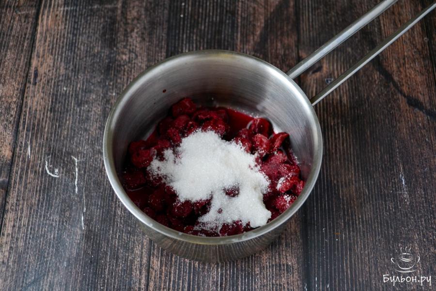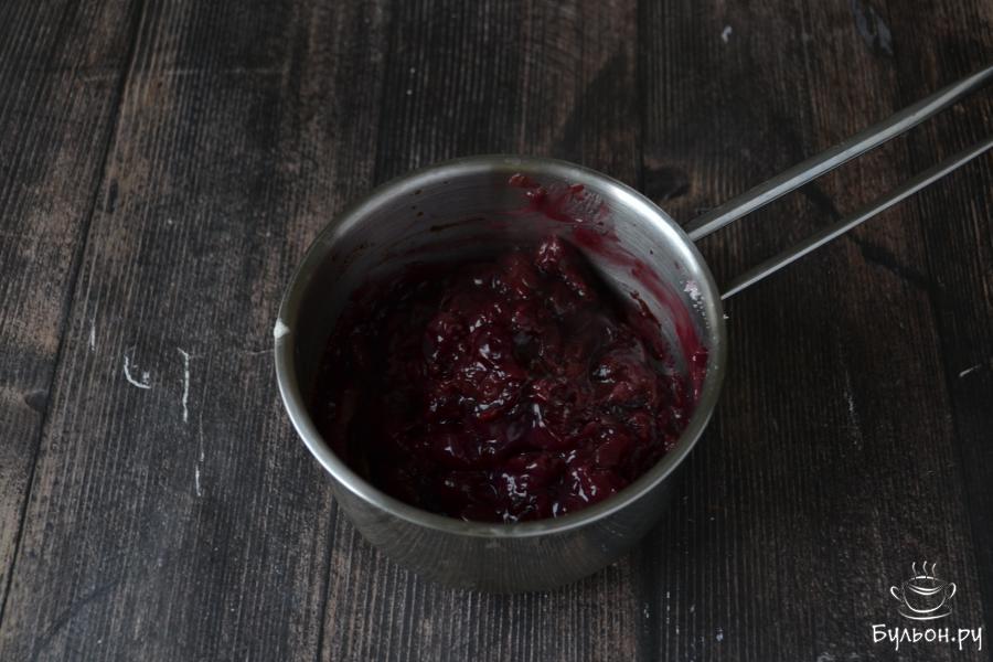 6. Вишню без косточек положите в сотейник. У меня домашняя заготовка - вишня, консервированная в собственном соку с сахаром. Можно взять замороженные ягоды. Тогда проварить их с сахаром нужно будет немного дольше и добавить сахар по вкусу.
