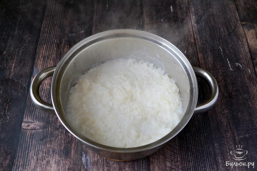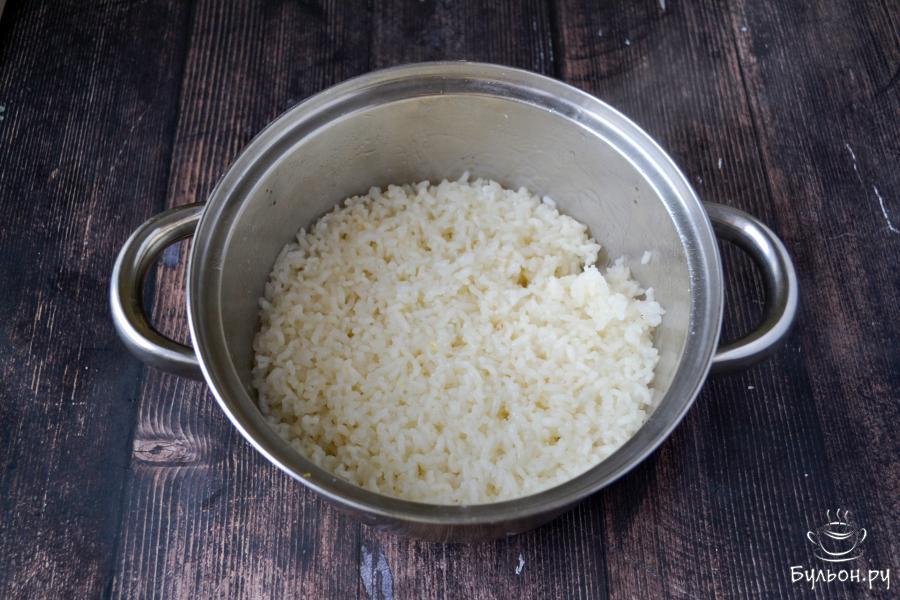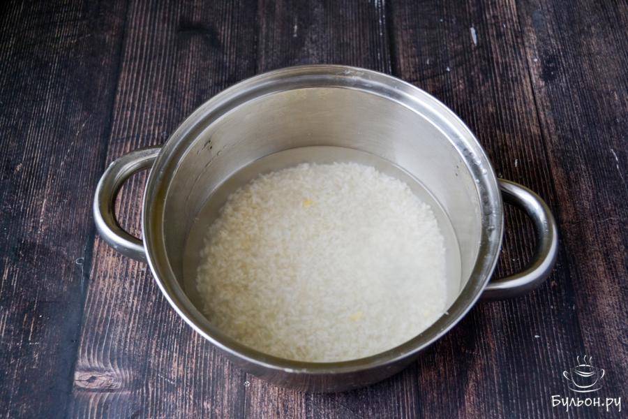 1. Круглый рис промойте до прозрачной воды. Положите в кастрюлю, залейте холодной водой, добавьте щепотку соли.
