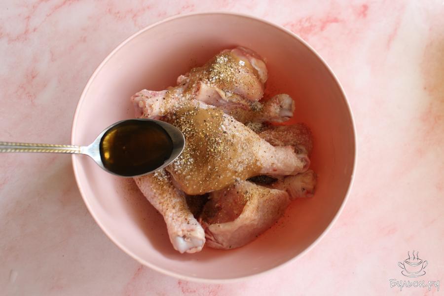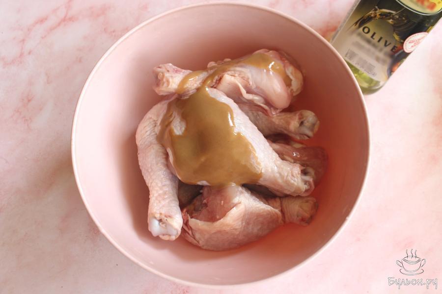 1. Подготовить голени. Голени промыть и выложить в глубокую посуду. Добавить горчицу и оливковое масло.