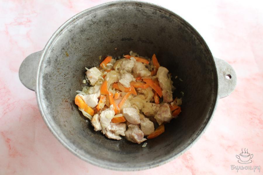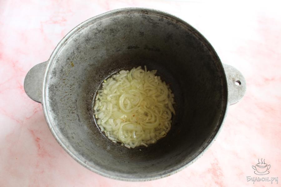 5. Выложить в казан промытую гречку, влить воду. Накрыть казан крышкой и готовить блюдо до мягкости крупы.