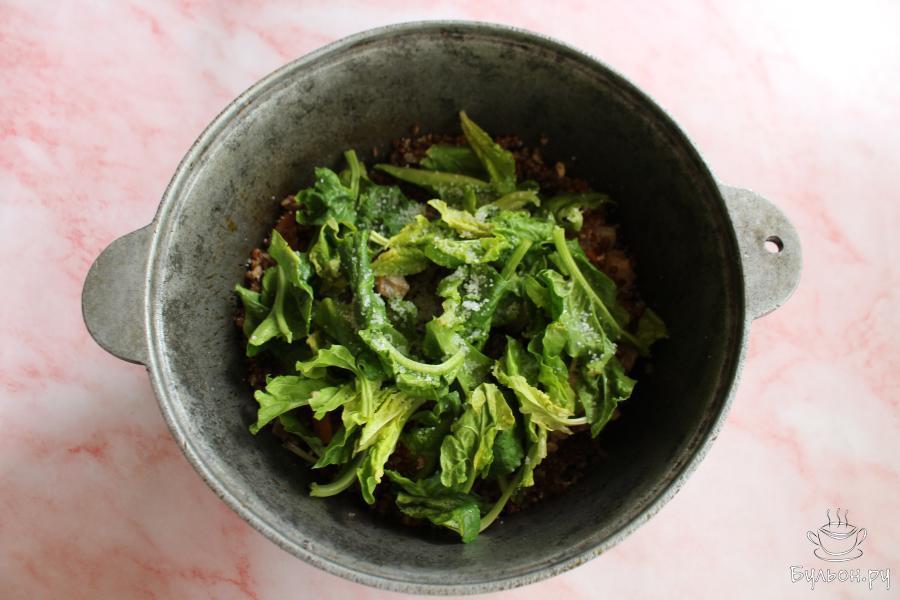 6. Выложить в казан шпинат, соль и перемешать. Накрыть казан крышкой и убрать посуду с огня. Через 5-6 минут можно подать блюдо.