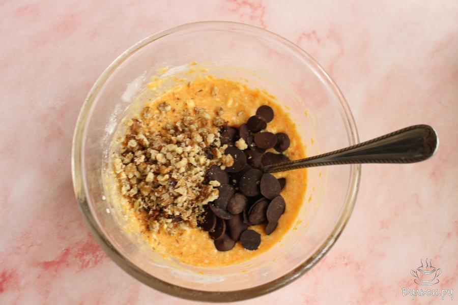 6. Орехи и шоколад измельчить любым удобным способом и добавить в тесто. Перемешать. Я использую шоколадные капли, их мельчить не нужно. Немного шоколада оставить для украшения пирога.