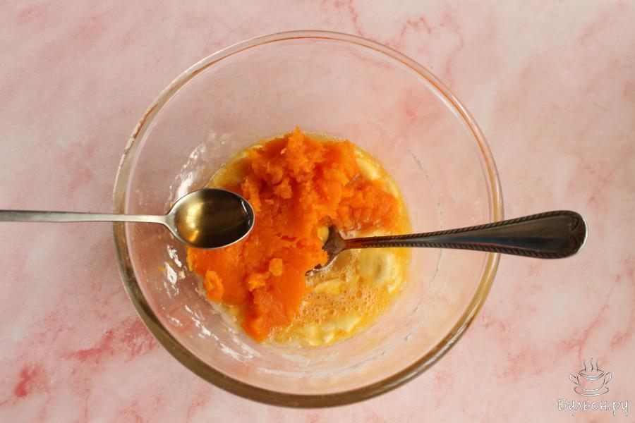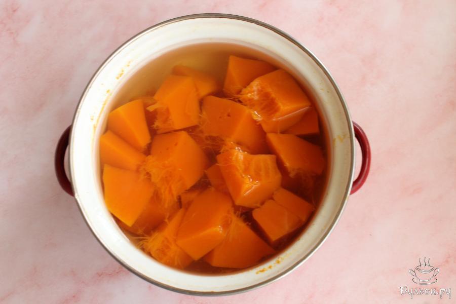 1. Тыкву почистить, нарезать крупно, залить водой и сварить до мягкости. Воду слить, а тыкву размять в пюре. После варки должно получиться 125 грамм пюре. Дать остыть пюре.