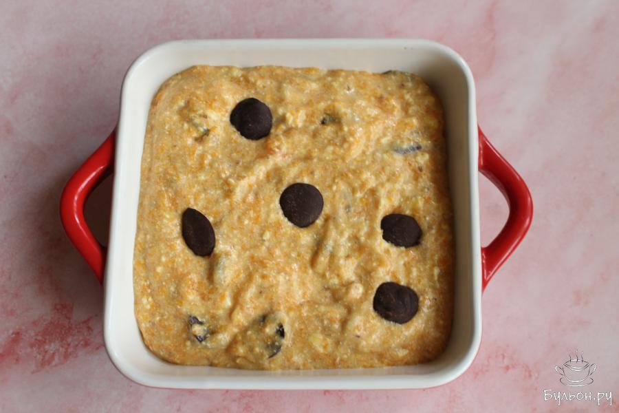 7. Выложить тесто в небольшую форму для выпечки и украсить шоколадом. Можно украсить пирог и орехами тоже.
