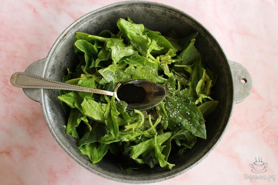 4. Выложить в казан промытый шпинат, добавить соевый соус и соль по вкусу. Перемешать и готовить блюдо минут пять. Если шпинат крупный, то нарезать его не очень мелко.
