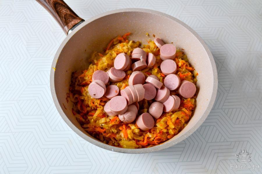 6. Положите в сковороду нарезанные кружочками сосиски. Перемешайте сосиски с овощами и обжарьте на огне выше среднего еще 5-6 минут.