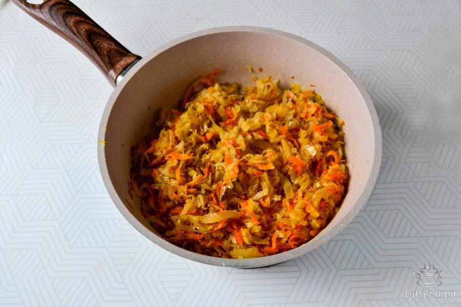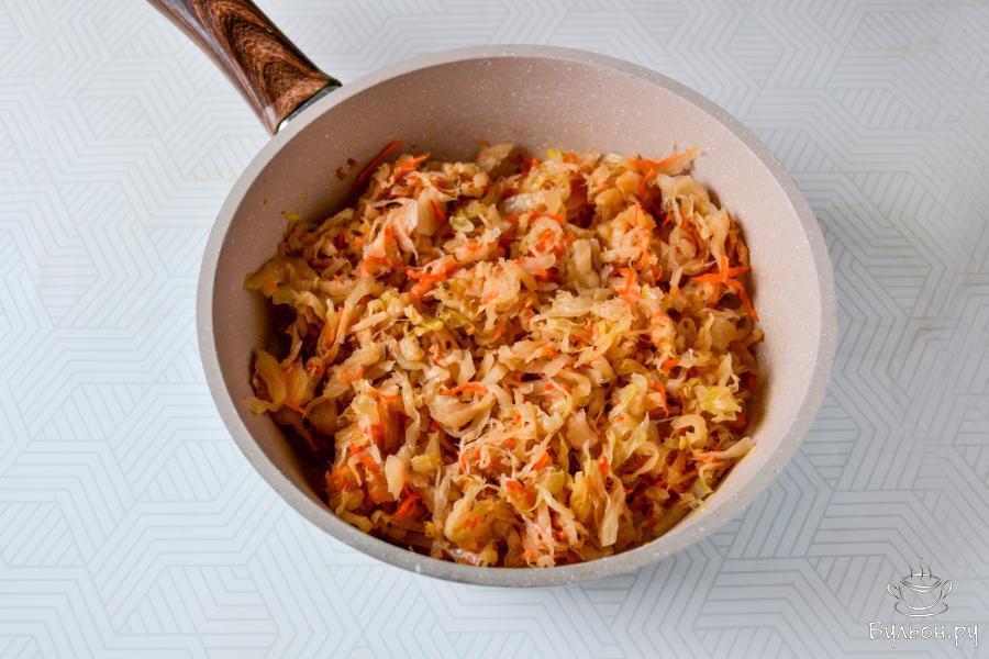 5. Перемешайте, тушите квашеную капусту примерно 20-25 минут на огне ниже среднего. Во время тушения можно добавить 1 ст. л. растительного масла.