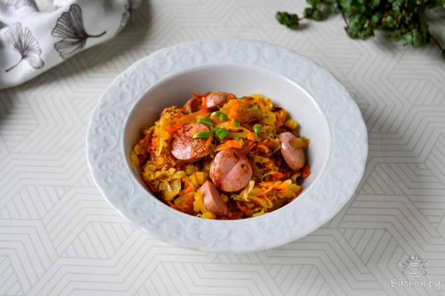 Квашеная тушеная капуста с сосисками - вкусное, ароматное и сытное блюдо, которое хорошо приготовить на семейный обед или ужин. Это сочетание популярно во многих странах центральной и восточной Европы, в Германии, Австрии. Самый близкий вариант - это польский бигус или бигост - готовится из простых продуктов, быстро на сковороде или в казане. Если квашеная капуста кислая, то промойте ее в холодной воде и отожмите руками. Сосиски выбирайте вкусные - от них будет достаточно сильно зависеть вкус готового блюда. По желанию в капусту можно добавить свежую или сушеную зелень укропа, петрушки, лука, а также будет уместно добавить томатную пасту, кетчуп или свежие помидоры. Капуста, сосиски соленые, поэтому соль добавляйте, если нужно, по вкусу в конце приготовления блюда.