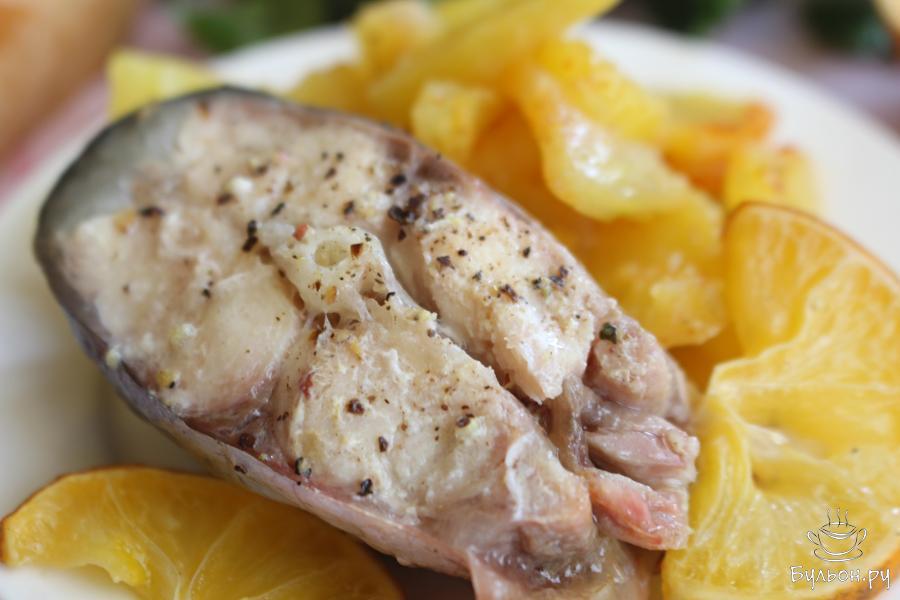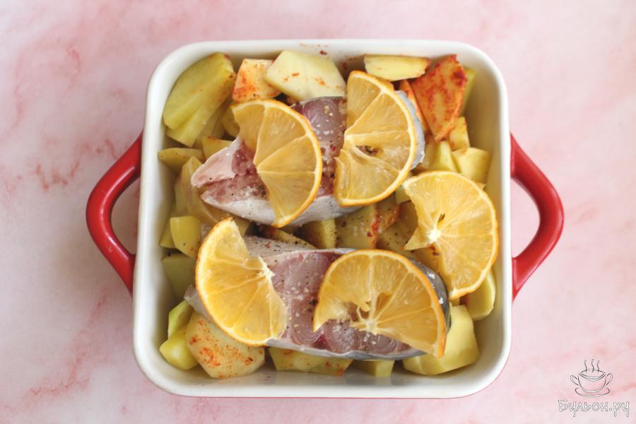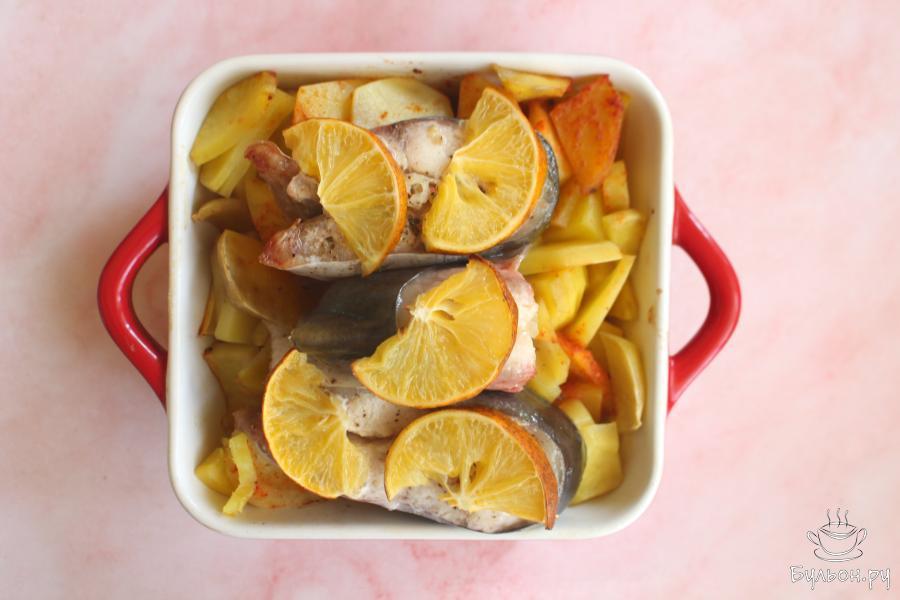 3. Форму достать, открыть, выложить на картошку кусочки рыбы. Выложить тонкие дольки лимона. Вылить на рыбу оставшееся масло, добавить соль и свежемолотый перец.