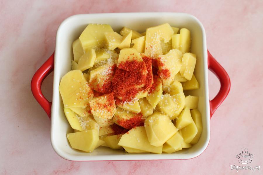 1. Картошку нарезать тонкими ломтиками. Выложить картошку в форму для запекания, добавить половину масла и сладкую паприку, перемешать.