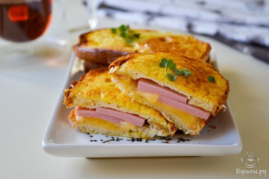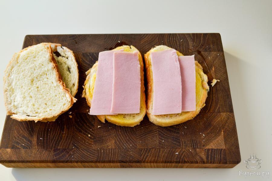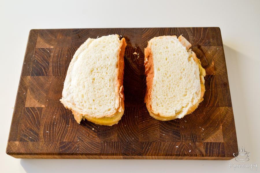 7. Через 3-4 минуты, когда поверхность поджарится, переверните бутерброд на другую сторону. Смажьте поверхность яйцом, верните на дальнейшее запекание.