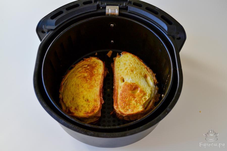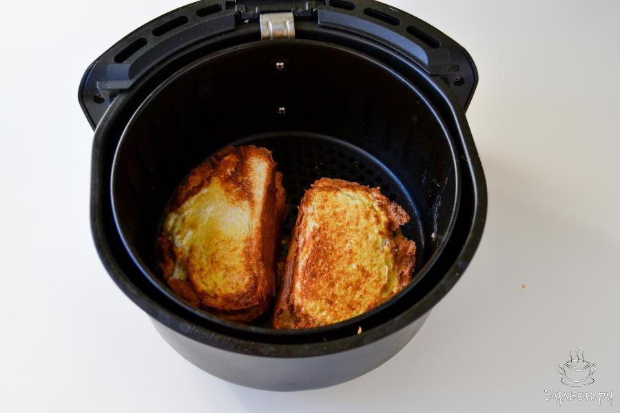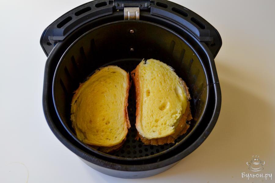 6. Поместите закрытые бутерброды в чашу аэрогриля. Смажьте поверхность яйцом. Включите аэрогриль на 180С на 5-7 минут.