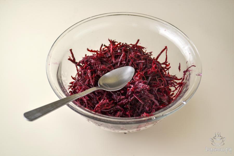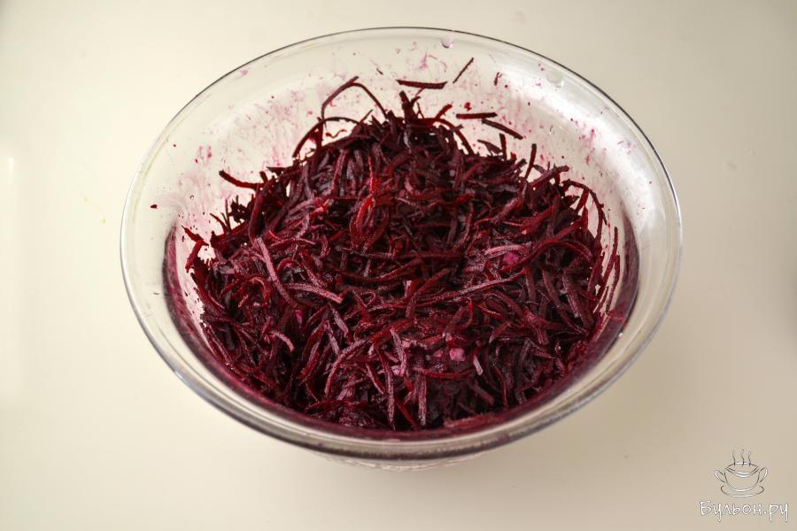 1. Сырую свеклу вымойте, почистите и натрите на мелкой терке. Положите в глубокую миску, влейте уксус и перемешайте.