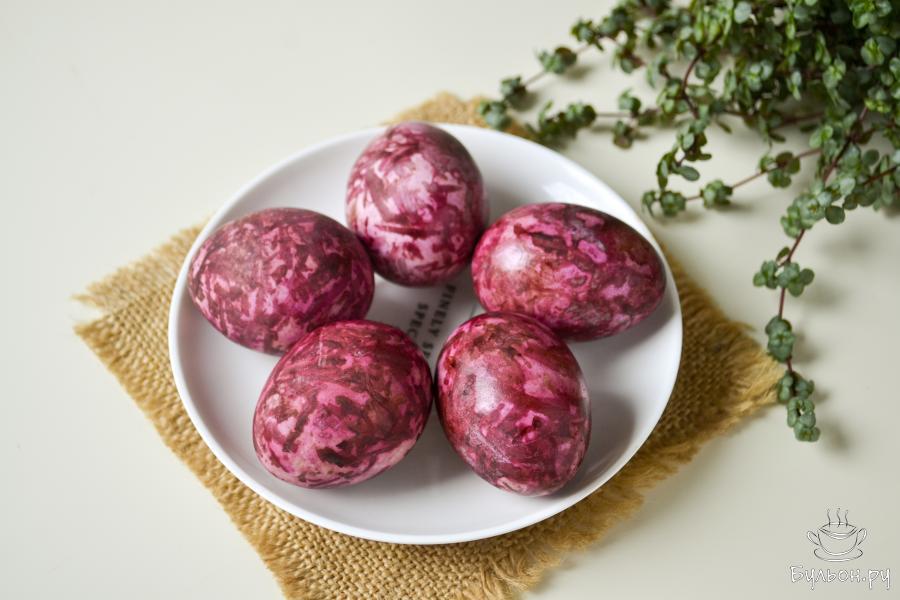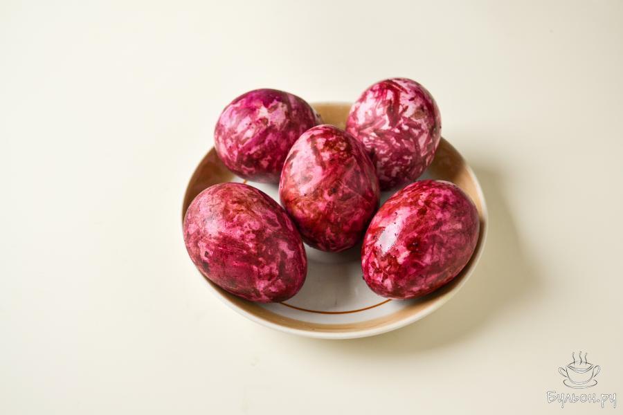 6. Достаньте яйца из свеклы, оботрите бумажной салфеткой. Для блеска протрите яйца ватным диском, слегка смоченным растительным маслом.