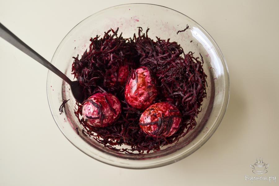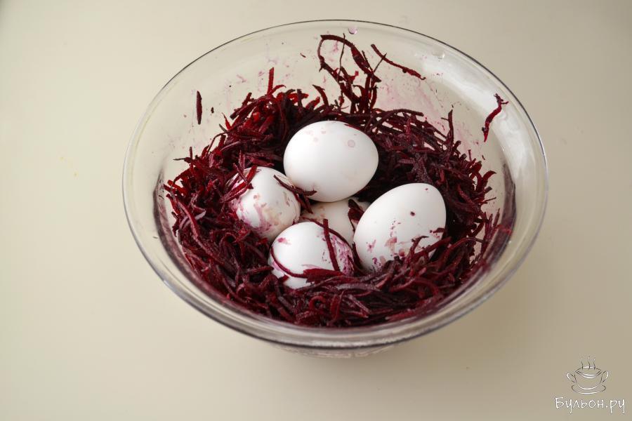 4. Перемешайте, чтобы каждое яйцо было покрыто натертой свеклой. Запрячьте яйца в свеклу полностью и оставьте на 2-3 часа. Если время позволяет, оставьте дольше. Я оставила яйца на всю ночь.