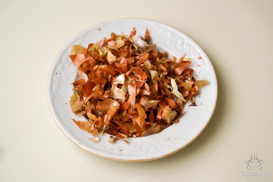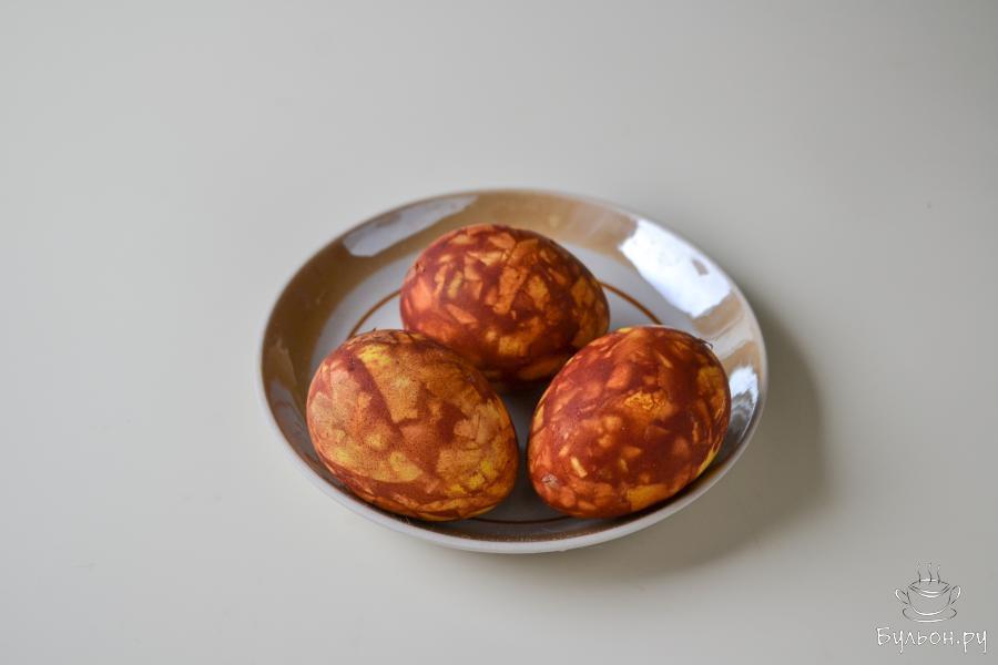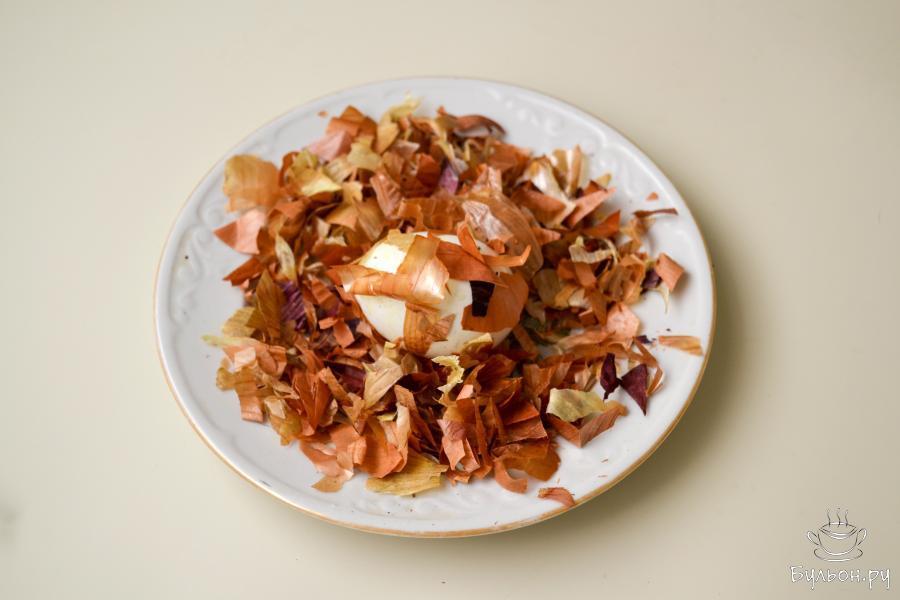 3. Яйца тщательно вымойте, не вытирая положите их в нарезанную шелуху, обваляйте так, чтобы яйцо было полностью покрыто кусочками шелухи.