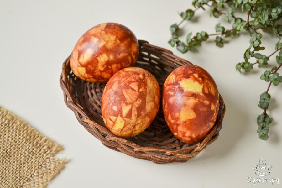 Мраморные яйца в луковой шелухе - это простой способ, как покрасить яйца на Пасху в домашних условиях без химических красителей. Такой метод позволяет получить не однотонный цвет, а красивый мраморный рисунок на скорлупе. В отличие от обычного окрашивания, где яйца просто варятся в шелухе и равномерно темнеют, здесь можно добиться необычного более интересного и натурального узора. Для окрашивания подойдет шелуха красного или желтого лука, или их смесь - все варианты будут выглядеть красиво. Способ подходит для белых и коричневых яиц, но на белых мраморный рисунок заметнее и контрастнее. Цвет зависит от времени варки и выдержки в отваре: чем дольше держать яйца, тем насыщеннее получится оттенок. Можно натереть яйца растительным маслом - так они приобретут красивый блеск и более праздничный вид.