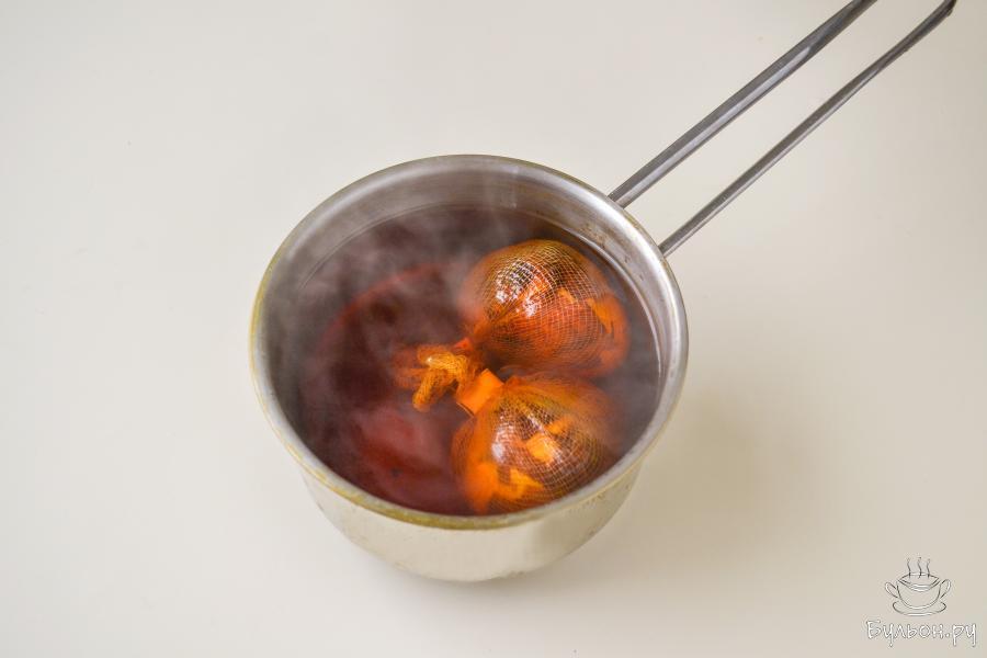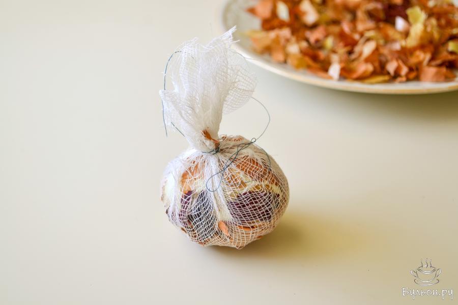 4. Положите яйцо на марлю, концы марли соберите вверху, завяжите ниткой или скрепкой плотно, чтобы во время варки не развязалось.